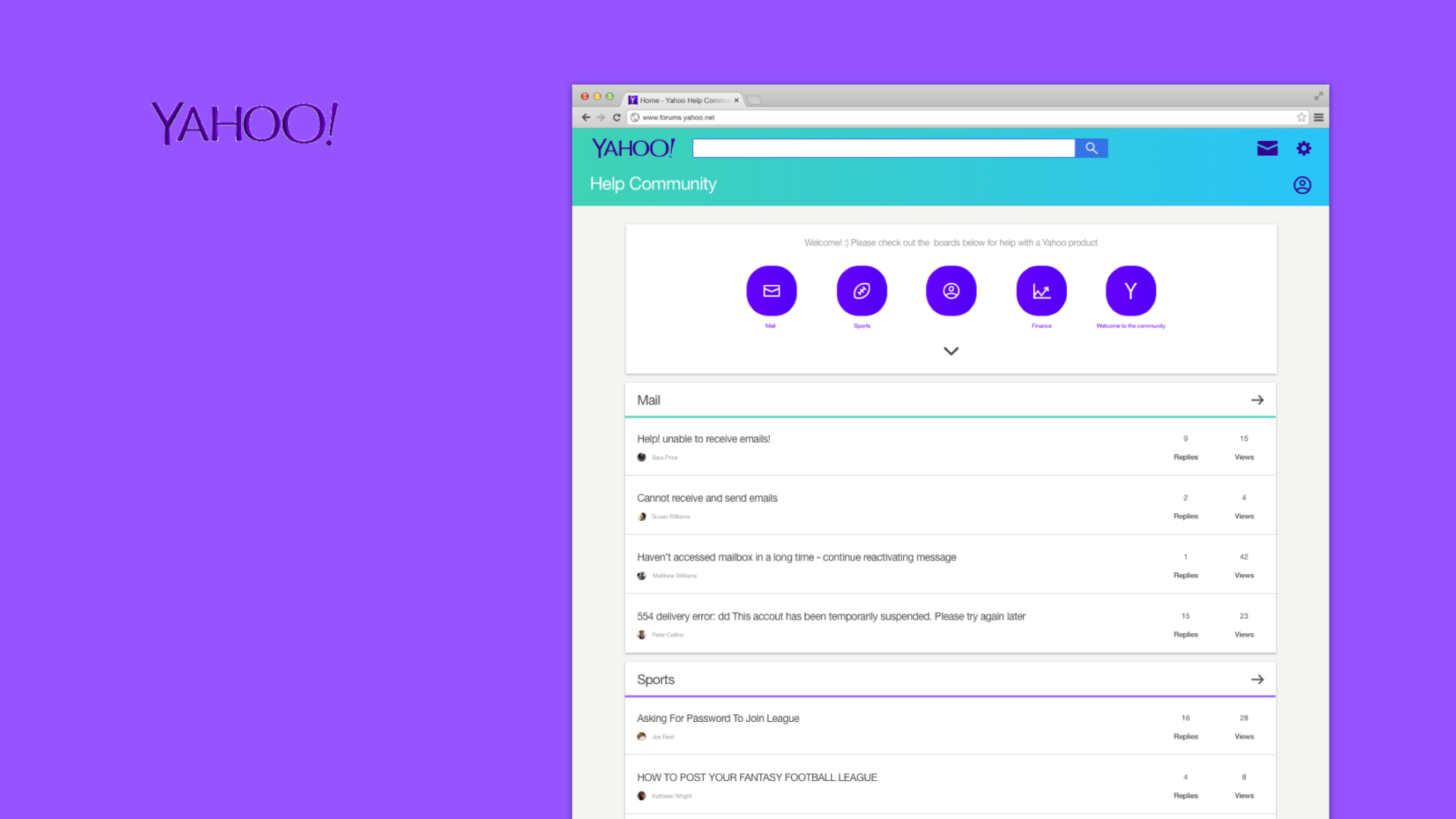 Improve the information hierarchy of the Yahoo help site based on user research. Design and launch a community forum site emphasizing the most needed products.